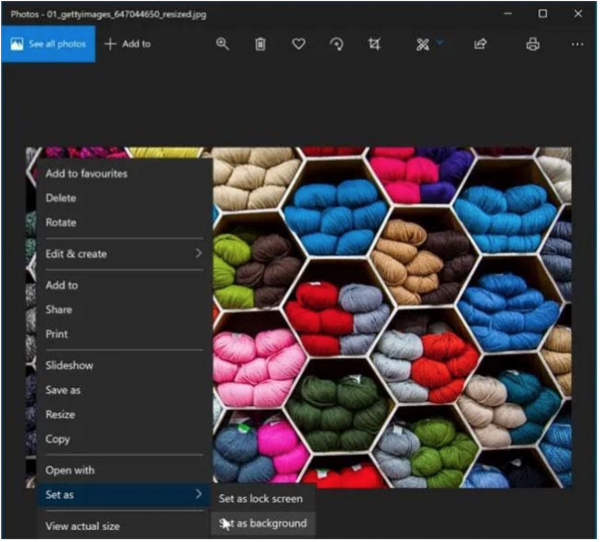 Bước 2: Sau khi hình ảnh được mở ra, hãy nhấp chuột phải vào file hình ảnh và chọn Set as. Tiếp đó nhấp vào Set as background để áp dụng làm hình nền cho máy tính của bạn.