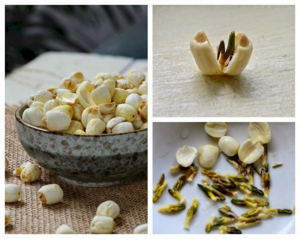- Bước 1: Hạt sen sau khi mua về rửa sạch. Loại bỏ phần vỏ và tim sen để không bị đắng cũng như chát sau khi nấu và sữa cũng sẽ mịn hơn. Đem ngâm với nước ấm trong khoảng 60 phút.