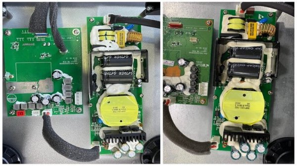Theo như những gì bạn thấy thì cấu trúc mạch nguồn, mạch công suất, và các IC điều khiển chính, các linh kiện mạch nguồn được đổ keo chống rung cẩn thận. Phần dây dẫn bọc mút chu đáo. Mạch điện cũng được in ấn rõ ràng nếu là hàng chuẩn. Hàng fake thì hoàn toàn không có điều này đâu nhé.