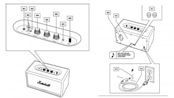 | 001 – Nguồn aux cho jack 3.5 mm 002 – Chỉ số nguồn 003 – Nút nguồn 004 – Khối lượng knob 005 – Bass knob 006 – Treble knob 007 – Nút phát / tạm dừng | 008 – Chìa khóa quyền lực 009 – Cổng bass 010 – Trở lại 011 – Đầu vào rca (trái và phải) 012 – Đầu vào chính 013 – Mains lead |