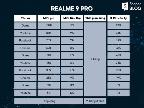 Kết quả kiểm tra thời lượng pin của smartphone pin trâu Realme 9 Pro (Nguồn: Shopee Blog)Theo kết quả, “sức chịu đựng” của pin Realme 9 Pro có thể lên đến 9 tiếng dưới một vài thiết lập tối đa. Khi sử dụng smartphone, thông thường hiếm có người dùng này lại thiết lập những thông số “max” như vậy, nên thời lượng pin có thể kéo dài lâu hơn. Cũng tương tự với dòng flagship OPPO, nếu chỉ thực hiện những tác vụ cơ bản, đơn giản như lướt web, nghe nhạc, giải trí nhẹ nhàng, thời lượng pin của Realme 9 Pro có thể sẽ còn ấn tượng hơn.