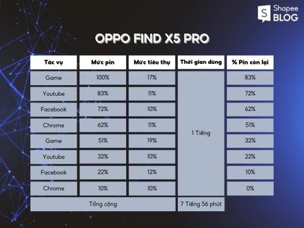 Kết quả bài kiểm tra thời lượng pin của OPPO pin trâu Find X5 Pro (Nguồn: Shopee Blog)Qua bài kiểm tra này, chúng ta có thể thấy rõ OPPO Find X5 Pro có khả năng hoạt động liên tục đến 8 tiếng với rất nhiều tác vụ. Trong đó còn có cả những tác vụ đồ họa nặng như chơi game Liên Quân. Nếu không được thiết lập với những điều kiện khắt khe như trên, và chỉ sử dụng cho những tác vụ cơ bản, dòng flagship này được dự đoán có thể hoạt động liên tục trong suốt một ngày.