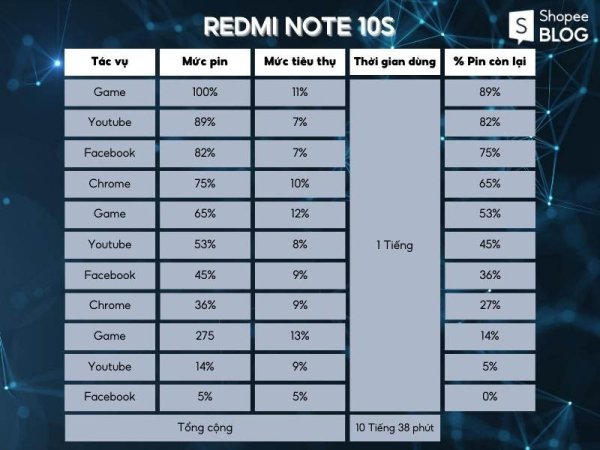 Quà bài kiểm tra có thể thấy, Redmi Note 10S có thể cùng bạn “chinh chiến” cả ngày dài với tần suất cao, đa tác vụ. Nếu hoạt động chơi game và giải trí liên tục, thời lượng pin có thể kéo dài trong 10 tiếng. Nhưng nếu bạn chỉ sử dụng những tác vụ cơ bản như lướt web, nghe nhạc, nhắn tin,… thời lượng pin có thể lên đến 19 tiếng. Đây chắc chắn sẽ là thời lượng thuộc hàng “top” trong phân khúc giá trung bình.