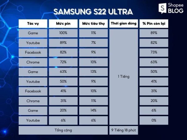 Kết quả kiểm tra thời lượng của S22 Ultra (Nguồn: Shopee Blog)Qua 2 bài test trên, có thể thấy rằng thời lượng pin của S22 Ultra tương đối vượt trội. Nếu bạn chỉ sử dụng chiếc điện thoại pin trâu này cho những tác vụ cơ bản hàng ngày, bạn có thể sử dụng liên tục trên 10h mà không phải nạp thêm pin. Thời lượng pin khi sử dụng các ứng dụng chơi game cũng tương đối dài, đáng đầu tư trong phân khúc.