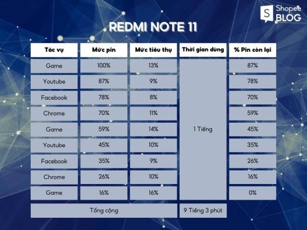 Kết quả test thời lượng pin Redmi Note 11 (Nguồn: Shopee Blog)Có thể thấy, Xiaomi Redmi Note 11 có thời lượng pin trên 9 tiếng khi thực hiện đa nhiệm liên tục trên điện thoại. Nếu chỉ sử dụng những ứng dụng cơ bản như Messenger, lướt Facebook hay xem video trên Youtube, thời lượng pin có thể kéo dài hơn 10 tiếng. Đây thực sự là một con số rất ấn tượng so với tầm giá. Bạn hầu như có thể dùng Redmi Note 11 suốt cả một ngày dài mà không cần phải sạc lại pin.