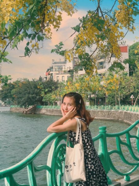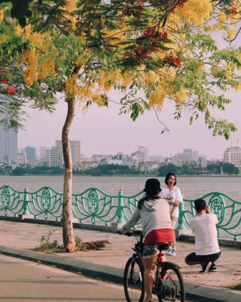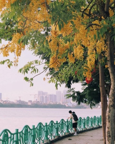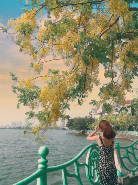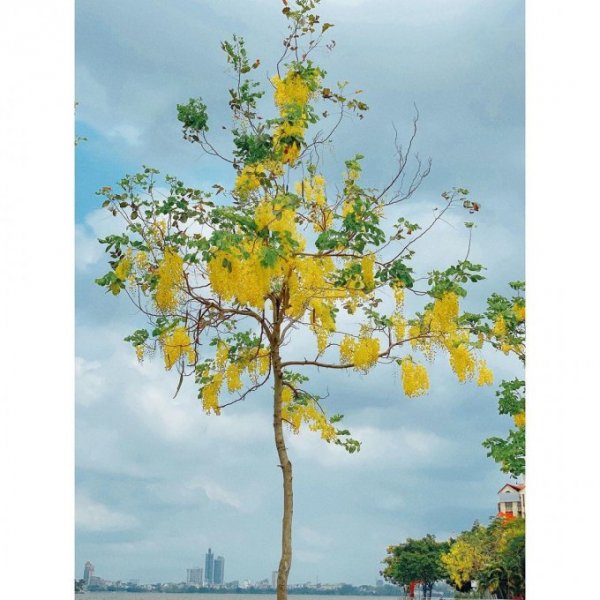 Những cây muồng hoàng yến ven Hồ Tây tuy nhỏ bé, khẳng khiu nhưng vàng trĩu các chùm hoa, như những chiếc đèn lồng đẹp mắt giữa trời khiến nhiều người trầm trồ, mải mê ngắm nhìn.