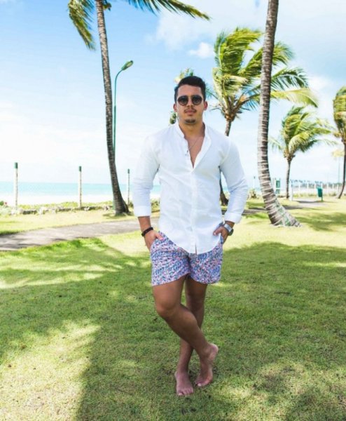 Bên cạnh hai item đã quá quen thuộc: áo phông và quần short, anh em hãy thử sáng tạo một chút với cách mix layer cùng một chiếc áo sơ mi hoạ tiết độc đáo. Tuy nhiên, bạn cần phối khéo léo giữa một chiếc áo phông trơn màu như đen, trắng, ghi,… với một chiếc áo sơ mi hoạ tiết sặc sỡ. Ngoài ra, vì điểm nhấn của bộ trang phục đi du lịch biển này chính là những chiếc áo, do vậy bạn hãy kết hợp cùng với một chiếc quần có màu sắc đơn giản và trơn màu thôi nhé!