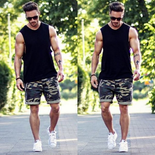 Đây là một công thức mix đồ đi biển kết hợp giữa áo ba lỗ với quần họa tiết rằn ri. Set đồ này sẽ giúp các chàng trai có thể khoe cơ bắp cuồn cuộn và body săn chắc của mình tại bãi biển. Nếu như bạn lựa chọn diện áo ba lỗ trơn thì có thể tạo thêm điểm nhấn với một chiếc quần có họa tiết. Bên cạnh những họa tiết hoa lá cành quen thuộc thì họa tiết rằn ri mang phong cách quân đội cũng là một gợi ý tuyệt vời dành cho các chàng trai thích sự nam tính, khỏe khoắn.