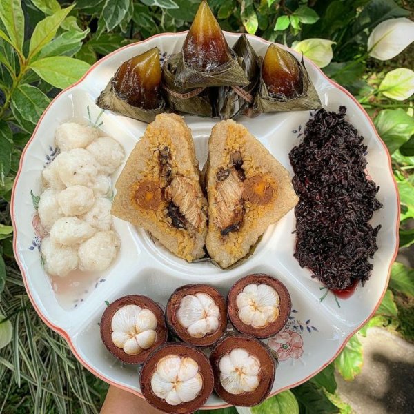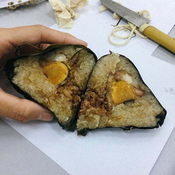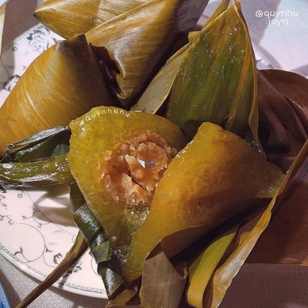 Cụ thể, phần nhân sẽ gồm nhiều nguyên liệu hơn như: thịt heo, hột vịt muối, nấm đông cô (hay nấm mèo), lạp xưởng, tôm khô, đậu phộng... Bánh thơm mùi thảo dược đặc biệt nên khi ăn vào sẽ thấy khác hẳn với bánh chưng, bánh ú của người Việt.