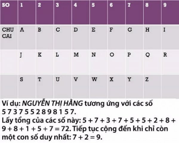 Để bói họ tên theo thần số học, bạn cần vẽ 1 ô vuông 3×3, so sánh tên mình theo bảng sau rồi ghi từng số vào ô vuông theo thứ tự từ 1 đến 9.