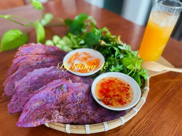 Bánh xèo khoai lang tím nhân tôm, mực, nấm kim châm.