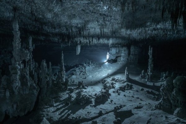 Bức ảnh kỳ lạ của Tom St George về người thợ lặn hang động trong một hang động tuyệt đẹp dưới lòng đất ở Mexico được xếp hạng cao nhất trong hạng mục khám phá đại dương.