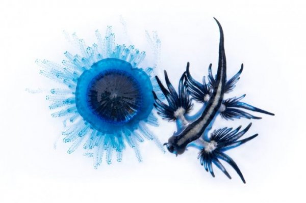 Loài động vật thân mềm có màu xanh sáng này đã giúp nhiếp ảnh gia Victor Núñez được đặc biệt chút ý trong danh mục đại dương, cuộc sống và sinh kế. Trong ảnh, loài động vật thân mềm bên phải đang ăn một con sứa, theo nhiếp ảnh gia Victor Núñez.
