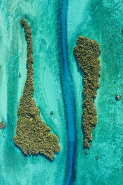 Ảnh chụp trực diện từ trên cao của Christophe Mason-Parker về hai hòn đảo nhỏ ở quần đảo Seychelles được xếp hạng thứ hai trong hạng mục cảnh biển trên mặt nước.