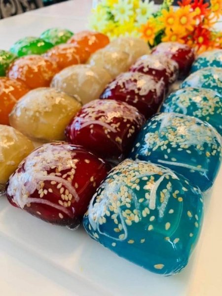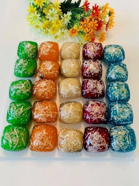 Mỗi màu bánh sẽ được 7 cái, tổng cộng sẽ được 35 cái bánh. Chờ bánh nguội bớt rắc vừng rang lên mặt bánh và gói bánh.