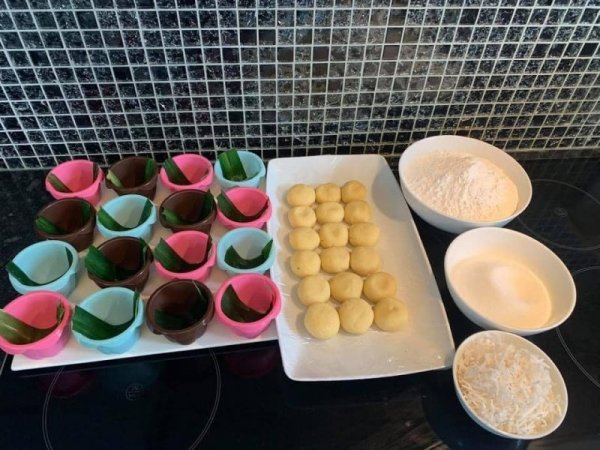 Thoa dầu ăn vào tay rồi gói bánh, xong cho vào khuôn silicon có lót lá dứa (lá nếp) nếu khuôn thường thì phải thoa một lớp dầu ăn để không dính.