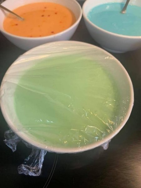 Lấy màng bọc thực phẩm bọc lại cho vào lò vi sóng bấm 1 phút, lấy ra trộn đều xong cho vào bấm thêm 30 giây nữa lấy ra trộn tiếp, nếu thấy bột đặc lại có màu hơi trong là được, còn nếu bột vẫn chưa đặc lại thì bấm thêm 10-20 giây nữa (hoặc cho lên bếp nấu lửa nhỏ, quậy đều cho đến khi bột sệt lại có thể gói bánh được)