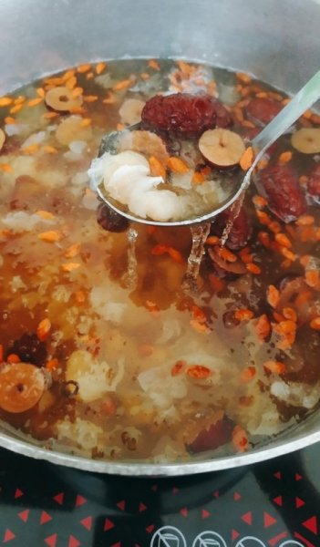 Cuối cùng, cho hạt sen, kỷ tử và hạt chia (nếu có) vào rồi tắt bếp. Tránh đun quá lâu vì sẽ làm nhừ tuyết yến, nhựa đào.