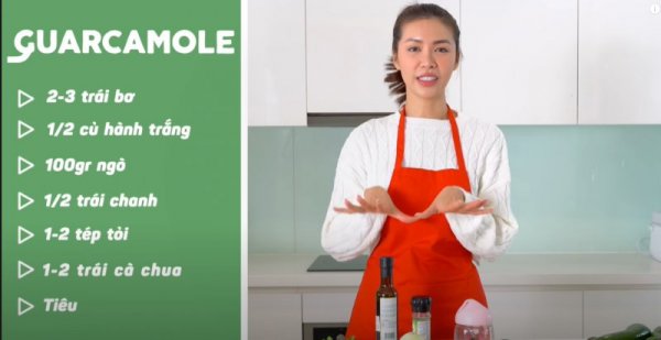 Đầu tiên, người đẹp hướng dẫn công thức làm món Guarcamole. Đây là một loại xốt bơ, cà chua ăn kèm với các loại snack, khoai tây chiên và bánh mì nên ngoài những nguyên liệu bên dưới, bạn nên chọn mua thêm một số loại snack (bim bim) yêu thích.