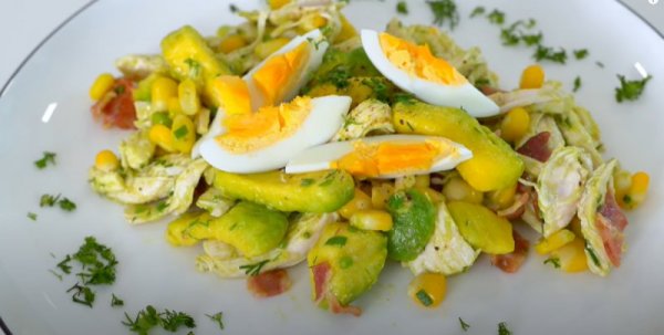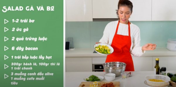 Là một trong những siêu mẫu nổi tiếng với thân hình chuẩn và khỏe khoắn, thực đơn hàng ngày của Minh Tú không thể thiếu hai thực phẩm trên. Đây là một công thức tự làm các món từ bơ rất đơn giản vì người xem chỉ cần cắt sẵn bơ, luộc và tách hạt bắp, luộc và xé ức gà thành sợi cho dễ ăn, rán bacon... thì gần như đã sắp hoàn thành. Minh Tú lưu ý, nếu có chế độ ăn đặc biệt thì bạn nên cho ít bacon lại để món salad thanh nhẹ hơn.
