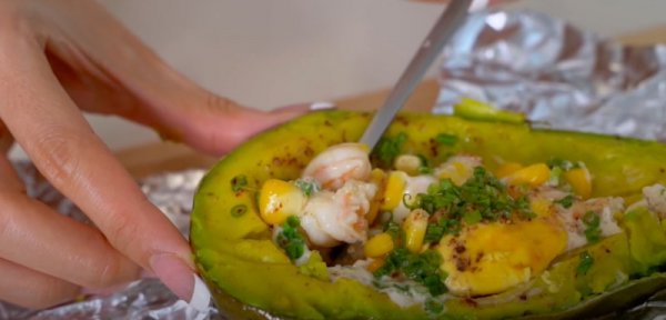 Bổ đôi bơ, nạo bớt một ít nhân bơ và cho tôm luộc, đã băm nhỏ vào lòng bơ