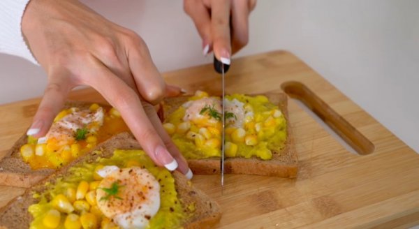 Phết hỗn hợp bơ lên bánh mì, cho trứng chần lên là hoàn thành