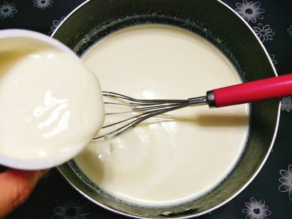 Bắc chảo chống dính lên bếp, đổ hỗn hợp vào chảo, đun ở lửa nhỏ cho phần hỗn hợp ấm dần lên. Trong khi chờ, bạn cho phần bột bắp cho vào chén nhỏ cùng với lượng nước đã chuẩn bị khuấy đều thành hỗn hợp đồng nhất.
