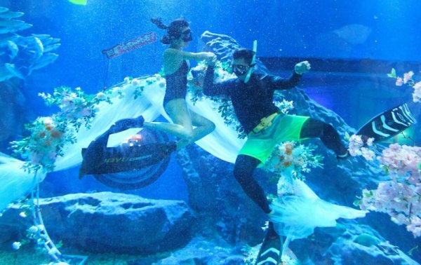 Một số cuộc thi tình cảm như thi hôn dưới nước cũng được nhiều người quan tâm. Đây là hình ảnh cuộc thi ngộ nghĩnh này tại công viên Haichang Occean ngày 25/8/2020.
