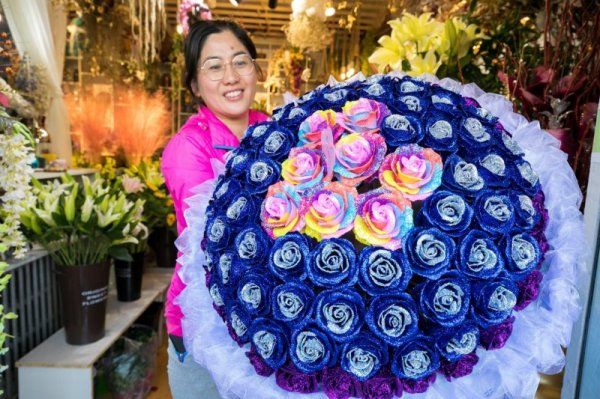 Cũng như ngày 14/2 ở Việt Nam, ngày Thất Tịch ở Trung Quốc cũng là dịp trọng đại với các cửa hàng hoa. Trong ảnh là một cửa hàng hoa ở Hohhot, Nội Mông với những bó hồng khổng lồ.