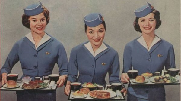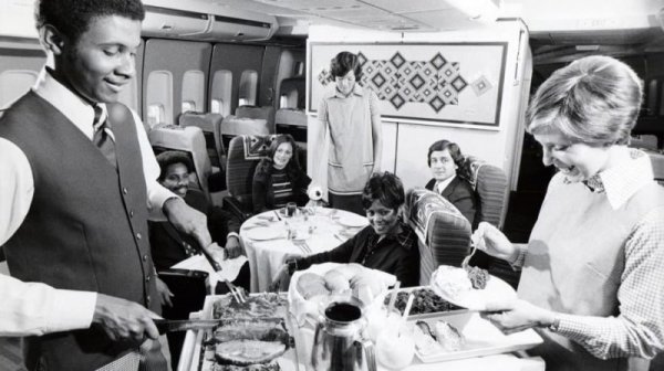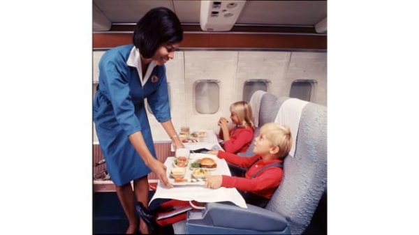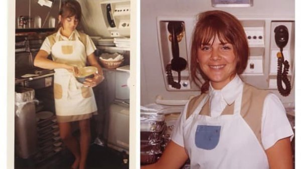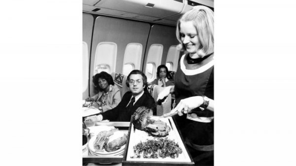 Quay trở lại thời kỳ hoàng kim của du lịch bằng đường hàng không, dịch vụ ăn uống trên máy bay khác hẳn thời nay. Một cựu tiếp viên hàng không của hãng Pan Am, Anne Sweeney, có thâm niên bay từ 1964-1975 đi khắp thế giới cho biết họ còn được huấn luyện để nấu ăn ngay trên máy bay, dù đó là buồng ngồi hạng cơ bản (coach).