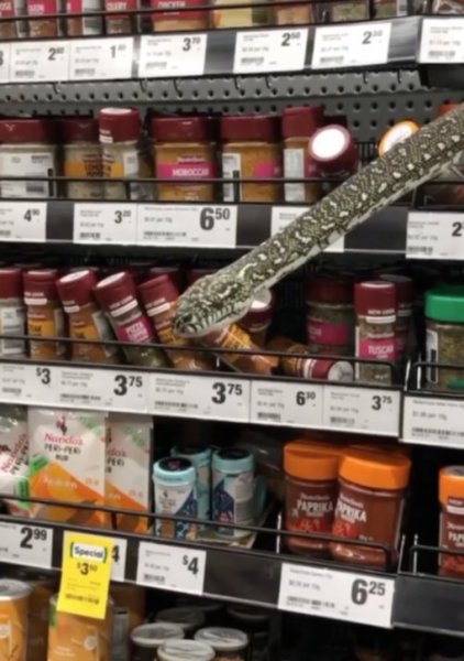 Helaina Alati, một công dân Australia, đang đi mua sắm ở cửa hàng bách hóa Woolworths thì gặp trăn dài 3 m, khỏe mạnh ngay khu vực quầy gia vị. nó trong khu vực thảo mộc và gia vị của cửa hàng địa phương của cô ấy.