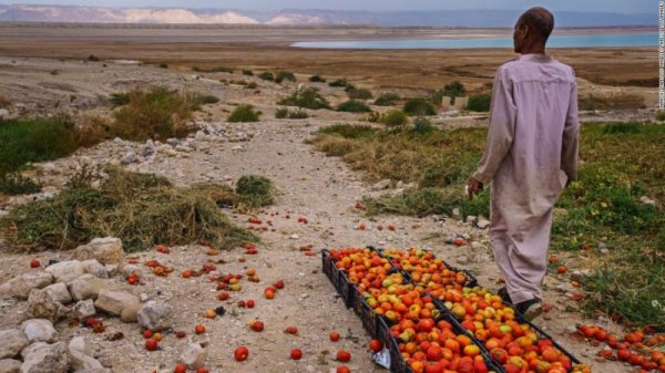 Một nông dân trồng cà chua nhìn ra khu vực mà Biển Chết đã lấy đi mọi thứ ở Ghor Haditha, Jordan. Ảnh: CNN.