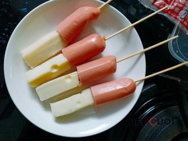 Cắt phô mai mozzarella và xúc xích cắt thành từng miếng có kích thước bằng nhau. Sau đó dùng giấy ăn thấm khô xúc xích và phô mai rồi dùng que xiên từng từng miếng sao cho chúng che kín đầu nhọn của xiên tre. Cứ mỗi một xiên gồm 1 phần xúc xích và 1 phần mozzarella.
