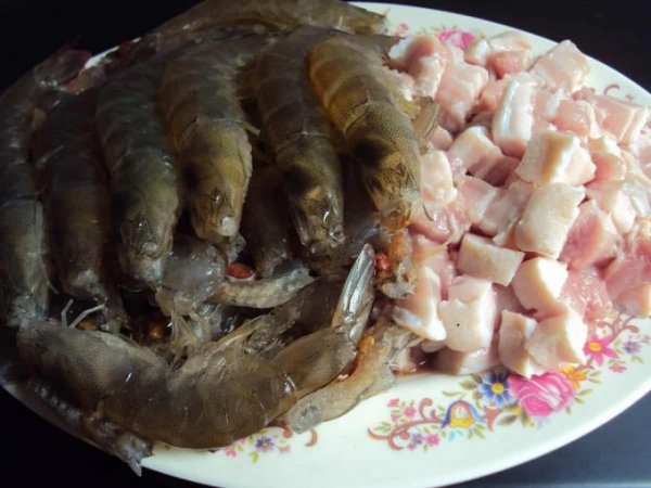 Thịt ba chỉ rửa sạch, cắt thành những miếng nhỏ cỡ ngón tay. Sau đó ướp với các gia vị tương tự như phần tôm, trộn đều để ngấm gia vị.
