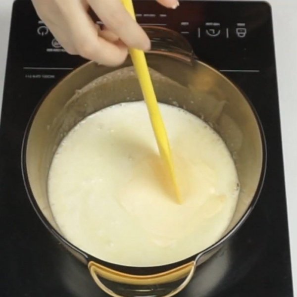 Cho 100ml whipping cream, 20g đường, 50g bột béo vào nồi, khuấy đều.