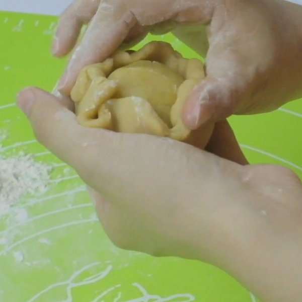 Miết dẹt phần vỏ bánh, cho nhân vào giữa rồi bao lại, vo tròn.