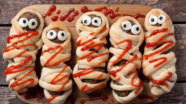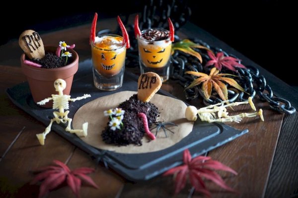 Đâu chỉ có hoạt động vui chơi, bữa tiệc quỷ ám cũng là một phần linh hồn cho đêm Halloween thú vị. Để có một cái gì đó chân thực hơn cho bữa tiệc, bạn có thể phục vụ kẹo ma quái. Như nhện Halloween và sâu gummy. Một số món ăn như ngón tay phù thủy gà và mì spaghetti với nước sốt “máu tươi” làm từ cà chua. Ắt hẳn sẽ làm khách mời vui điên đảo tâm hồn. Vài chiếc bánh tạo hình tử thi và xác sống hoặc macaron được trang trí một cách quái dị cũng là ý tưởng không tồi đó nha!