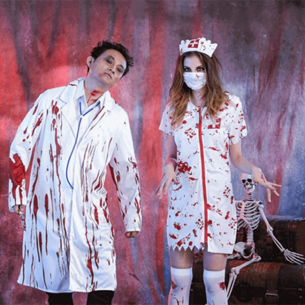 [/i]Có nhiều bộ phim hoặc những câu chuyện kinh dị gắn liền với hình ảnh bác sĩ, y tá đem đến những ý tưởng táo bạo trong việc tạo ra trang phục hóa trang Halloween cho các bạn trẻ. Những chiếc áo blouse trắng đơn giản, kết hợp mực đỏ vẩy lên nổi bật như các vết máu sẽ giúp bạn tỏa sáng và ấn tượng trong đêm lễ hội.