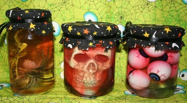 [/i]Để trang trí Halloween cho lớp học theo kiểu phòng thí nghiệm Halloween ma quái, bạn cần sưu tập những ống nghiệm, chai lọ thủy tinh, màu thực phẩm để tạo thành các dung dịch ghê rợn. Để có một chiếc đầu ngâm phoóc-môn đầy ghê rợn, bạn chỉ cần in hình ra giấy cứng, cuộn lại rồi cho vào lọ thủy tinh có màu xanh như dung dịch ướp xác. Hoặc phong phú hơn nữa, bạn có thể mua các bộ phận cơ thể ở cửa hàng bán dụng cụ khoa học về bỏ vào lọ thủy tinh có sẵn nước màu là xong.