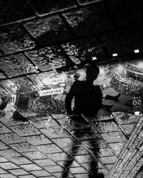 Mô tả ảnh 'Never quite free': Bóng của một người đàn ông đơn độc trên vỉa hè ngoài ga Shibuya. Có vẻ như anh ấy đã thoát khỏi áp lực của cuộc sống hối hả hàng ngày ở đô thị, nhưng nhìn kỹ hơn, nhân vật vẫn bị bao quanh bởi đám đông các bảng hiệu đèn neon rực rỡ, chói lọi. Có cảm giác hình ảnh phản chiếu nói lên tâm trạng thật hơn những gì người ta thấy bên ngoài. Ảnh: Debbie Smyth/AAP.