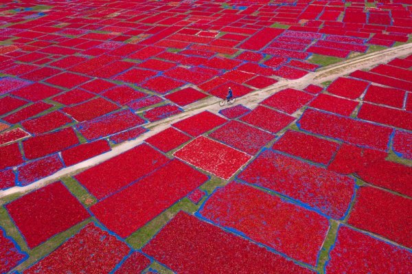 Mô tả ảnh: Một người nông dân đang trở về nhà sau khi thu hoạch ớt. Trong mùa thu hoạch kéo dài hai tháng, hàng tấn ớt phơi khô tạo nên cảnh tượng đẹp mắt ở một huyện phía Bắc Bangladesh.Ảnh: Sujon Adhikary/APP.