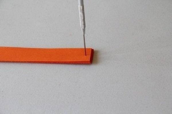 Bước 1: Gấp đôi tờ giấy màu, rồi cắt 13 nan giấy có bề ngang khoảng 1-2 cm. Sau đó đục một lỗ nhỏ ở phần gáy (nếp gấp đôi).