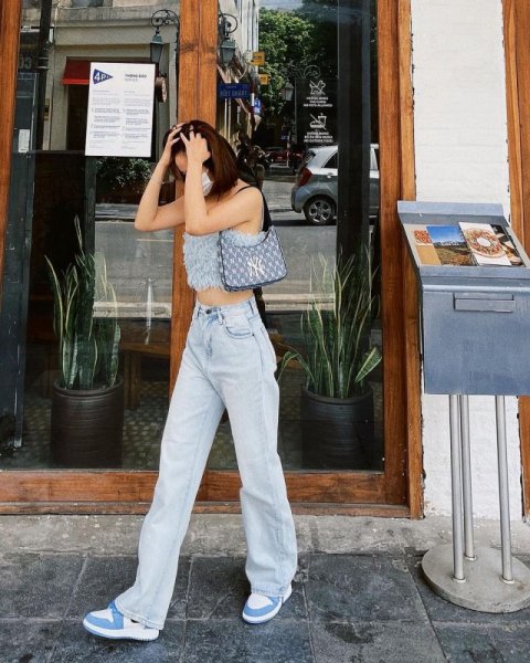 Khi chán màu đen, nữ diễn viên sẽ chọn mặc áo 2 dây chất liệu lông xù cùng quần jeans ống suông. Phụ kiện đi kèm sẽ là giày sneaker và túi đeo vai cùng màu.