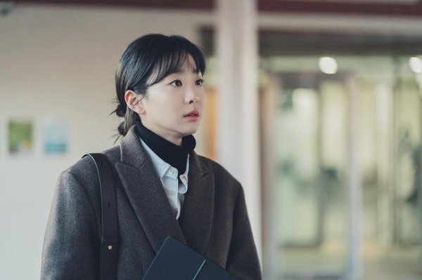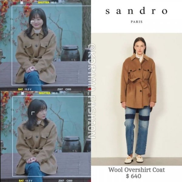 Năm nay, xu hướng layer áo len cổ lọ với áo sơ mi trắng đang trở thành trend và người đẹp 26 tuổi đã mang xu hướng này vào phim và khoác ngoài một chiếc áo dạ oversize màu nâu hết sức cá tính. Với combo layer nhiều lớp thế này, Kim Da Mi lựa chọn cách búi tóc thấp để diện mạo thoáng hơn.