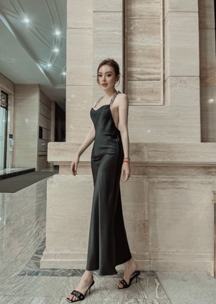 Trang Nemo không quá cứng nhắc trong việc mix đồ, nhưng cô nàng thường ưu tiên những item có thể khoe được lợi thế hình thể như chiếc váy lụa hai dây hở lưng sâu.