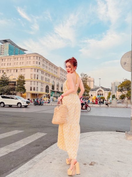 Khi mặc váy maxi, phụ kiện không thể thiếu của bà chủ online chính là những đôi giày cao gót khủng.
