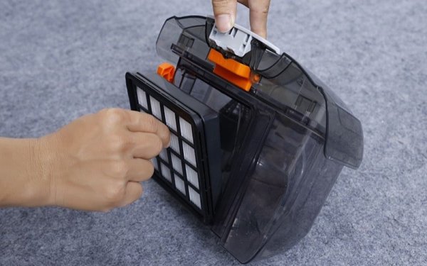Mặt dưới hộp chứa bụi là vị trí màng lọc, mở khớp khóa bạn sẽ lấy được màng lọc ra ngoài. Bên trong có 1 tấm mút, bạn có thể giặt sạch, phơi khô và lắp ngược trở lại máy.