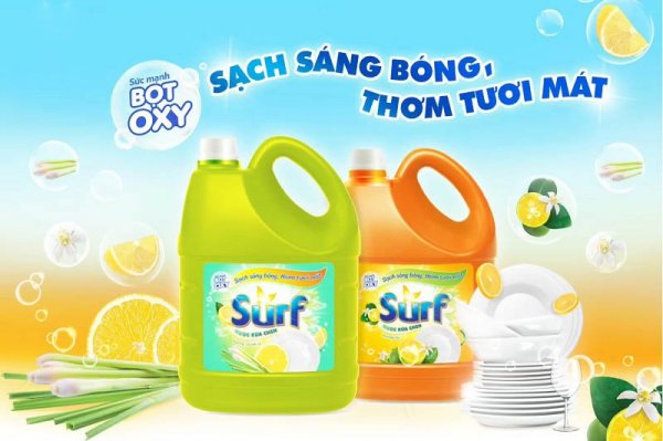 Các loại nước rửa chén của Surf cũng đã đồng hành trong căn bếp của nhiều gia đình Việt. Sản phẩm được chiết xuất từ chanh tươi, quất, sả giúp làm sạch dầu mỡ và những vết bẩn cứng đầu hiệu quả, an toàn cho người dùng.