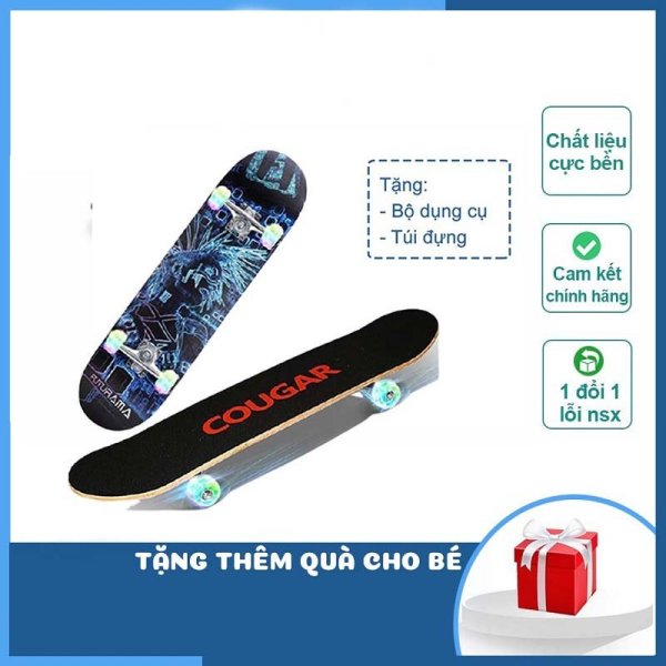 Skateboard cho người mới bắt đầu của hãng Cougar chưa bao giờ khiến người dùng phải thất vọng. Ngoài loại ván 9 lớp như trên thì ván 8 lớp gỗ chống nước cũng là một gợi ý không tồi. Mặt trên có lớp nhám giúp hạn chế trơn trượt. Mặt bên dưới có nhiều hình ảnh độc đáo thể hiện cá tính của các bạn trẻ. Thiết kế sản phẩm an toàn đối với người dùng từ 6 tuổi trở lên.