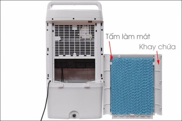 - Bước 1: Bạn tháo khay chứa làm mát ra khỏi quạt hơi nước.